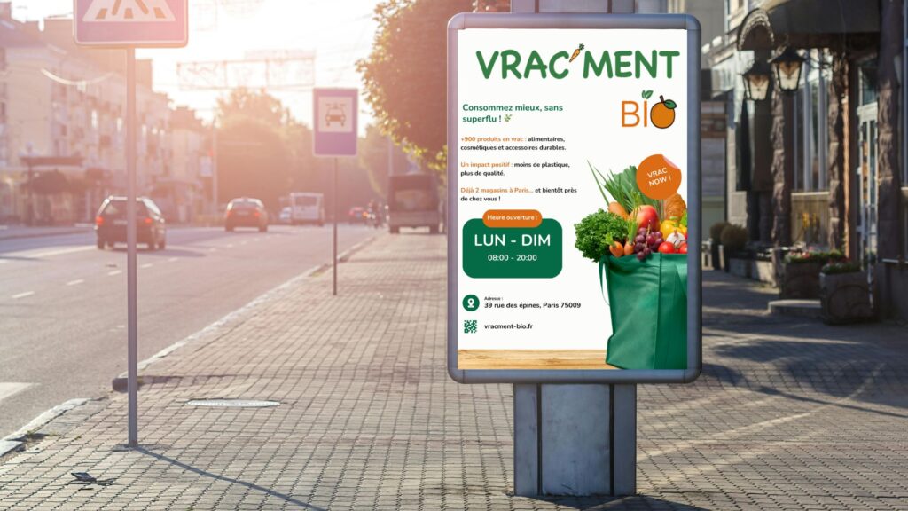 Visuels déclinés sur plusieurs supports, sticker personnalisé, sac kraft, emballage eco-responsable, affiche pour panneau publicitaire.